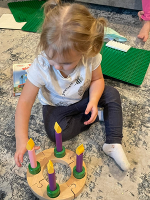 child playing with wooden advent wreath set
