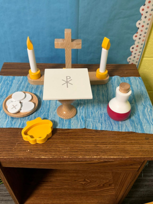 Tactile tools like this are great for teaching the faith to little ones. Worship is not just sedentary, but participatory. When they can 'play,' they can find that much more meaning in worship.